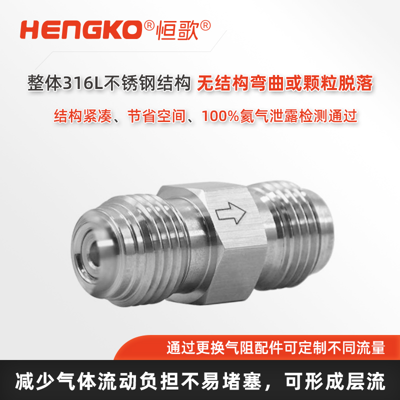 RF系列多孔金屬限流器采用高純316L不銹鋼燒結(jié)技術(shù)制造,適用于高壓、高流量、超高純氣體輸送系統(tǒng)。當氣體管線破裂、閥門異常或調(diào)壓器失效時,它能自動限制過量氣體瞬間噴出,有效保護氣路系統(tǒng)安全,避免工藝中斷或設(shè)備損壞。