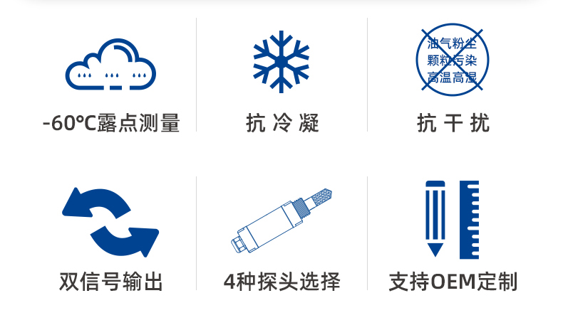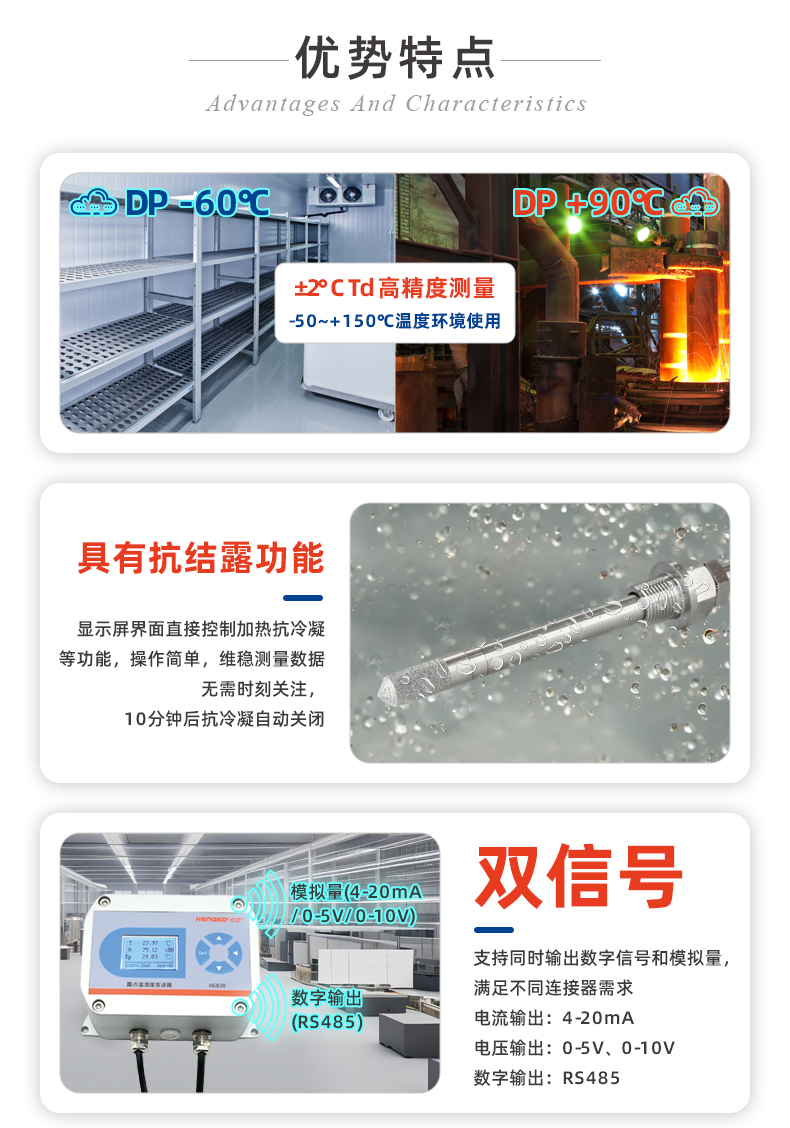 ●模擬量輸出:露點(diǎn)+溫度(濕度值僅供參考)4~20mA/0-5V/0-10V(三選一)